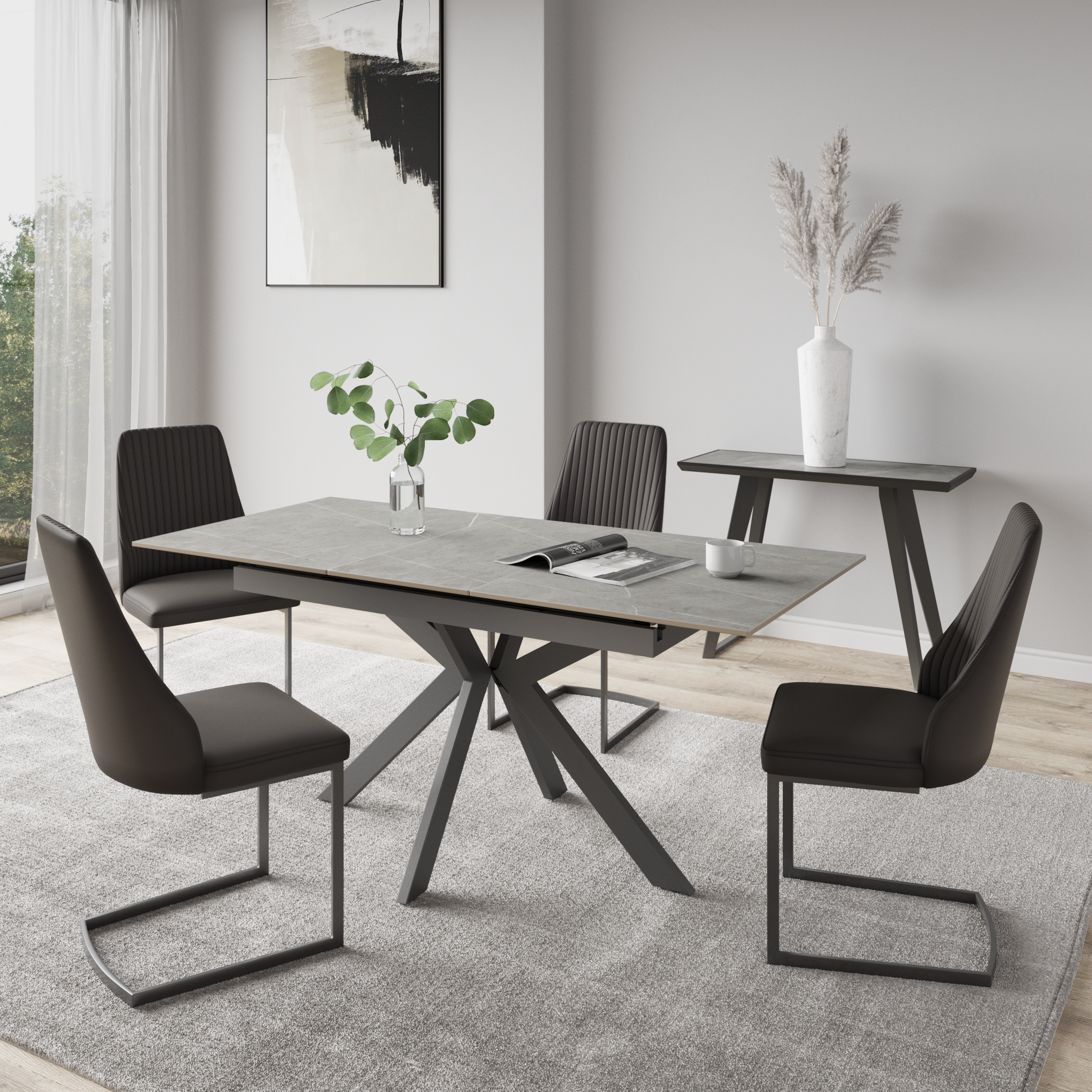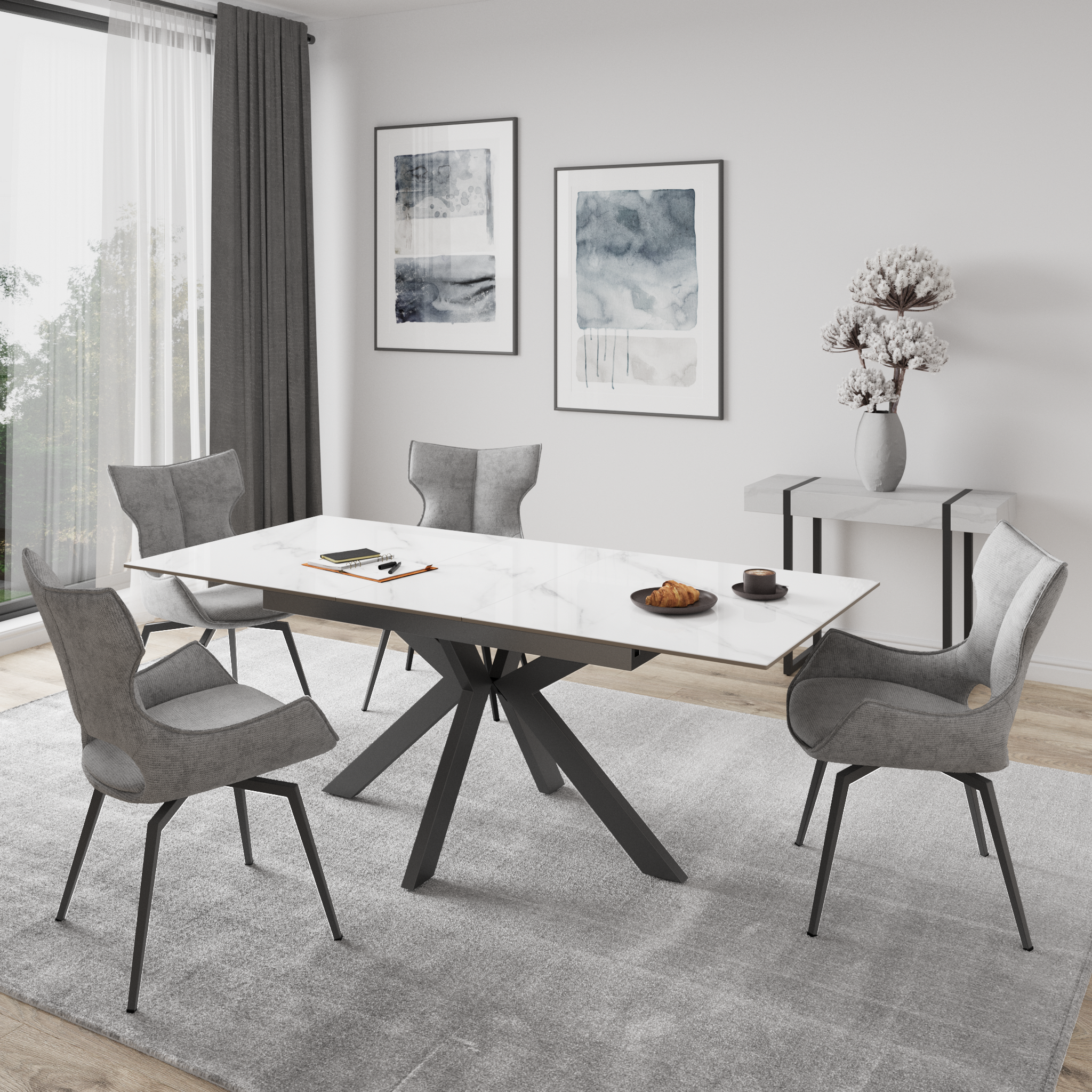 The Aramis Ceramic Dining Table Range combines contemporary design with exceptional functionality. Available in matte grey ceramic, gloss white marble ceramic, and wood-look ceramic finishes, these tables suit a variety of modern interiors. Offered in two sizes, the small table extends from 130 cm to 170 cm, while the large extends from 160 cm to 200 cm, both featuring a dark grey cross-legged frame and a smooth auto-rise extension mechanism. Built for everyday living, the ceramic tops are heat-resistant, scratch-resistant, and stain-resistant, ensuring durability and easy maintenance. The Aramis range is the perfect choice for stylish, practical dining.