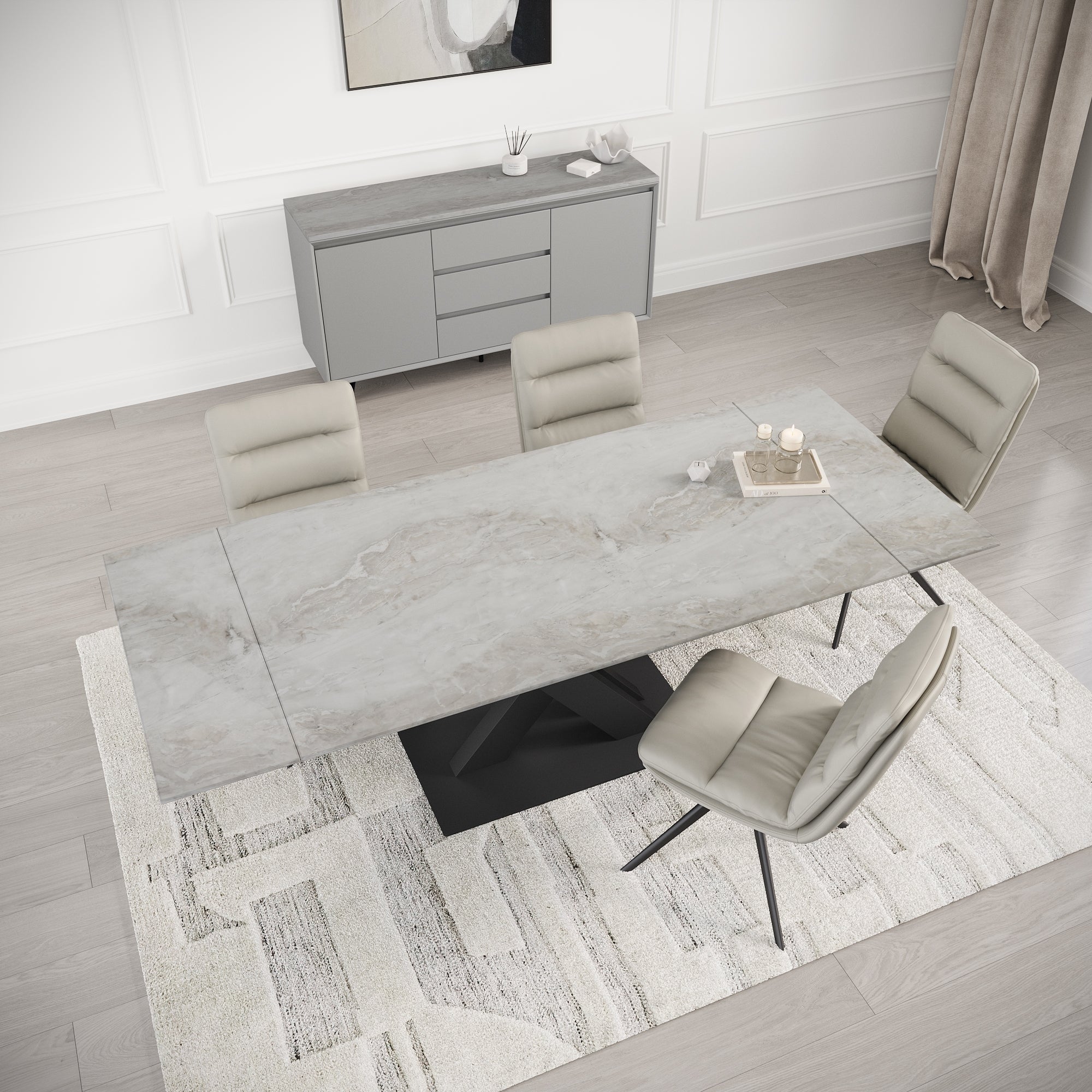 The Bari Range combines luxury and practicality with a solid grey marble core encased in a sleek marble foil gloss, offering modern durability and refined style. Its surfaces are heat-, scratch-, and stain-resistant for effortless maintenance and lasting elegance. The Bari Dining Table features a bold black metal X-shaped pedestal base and an end-extension mechanism, perfect for everyday dining and entertaining guests.