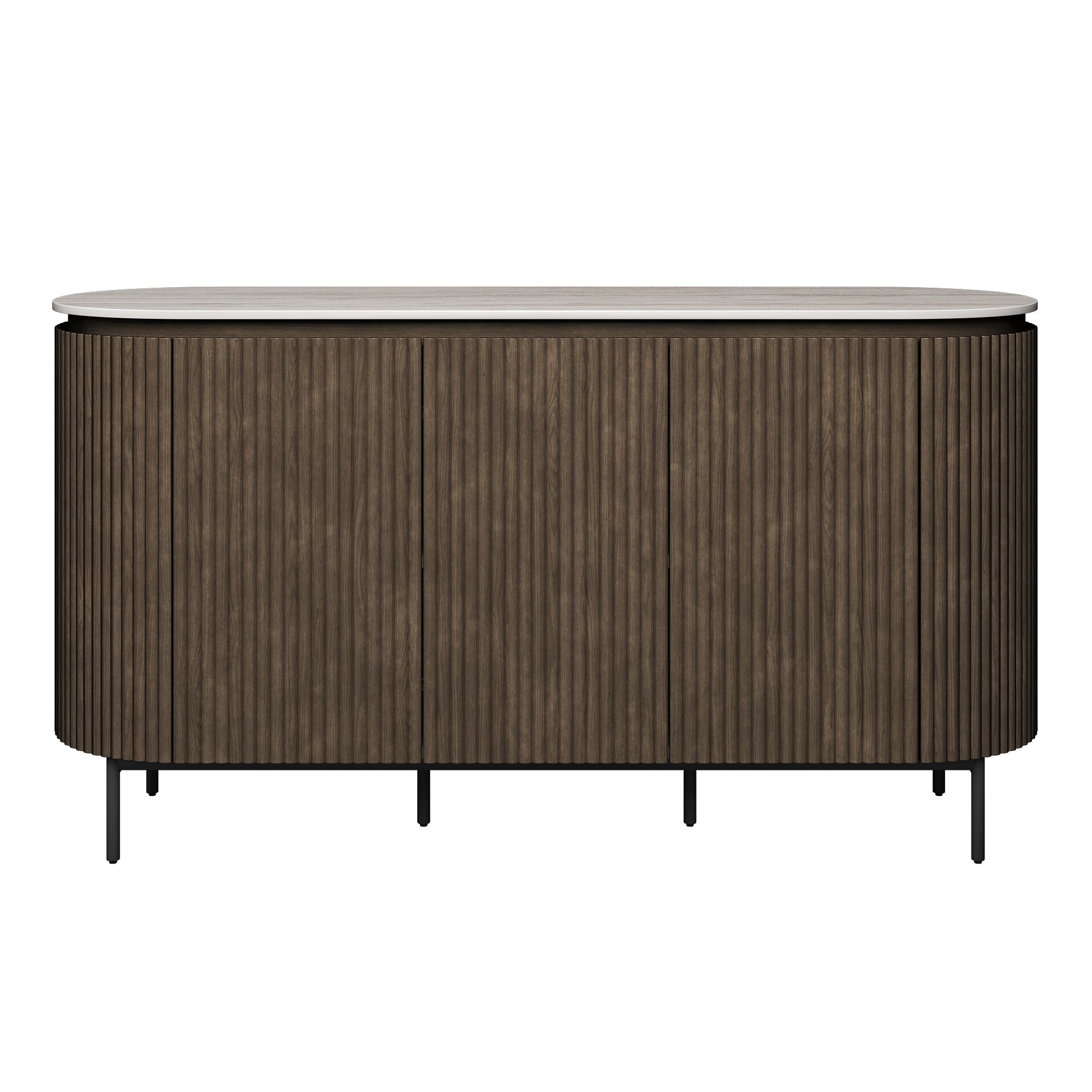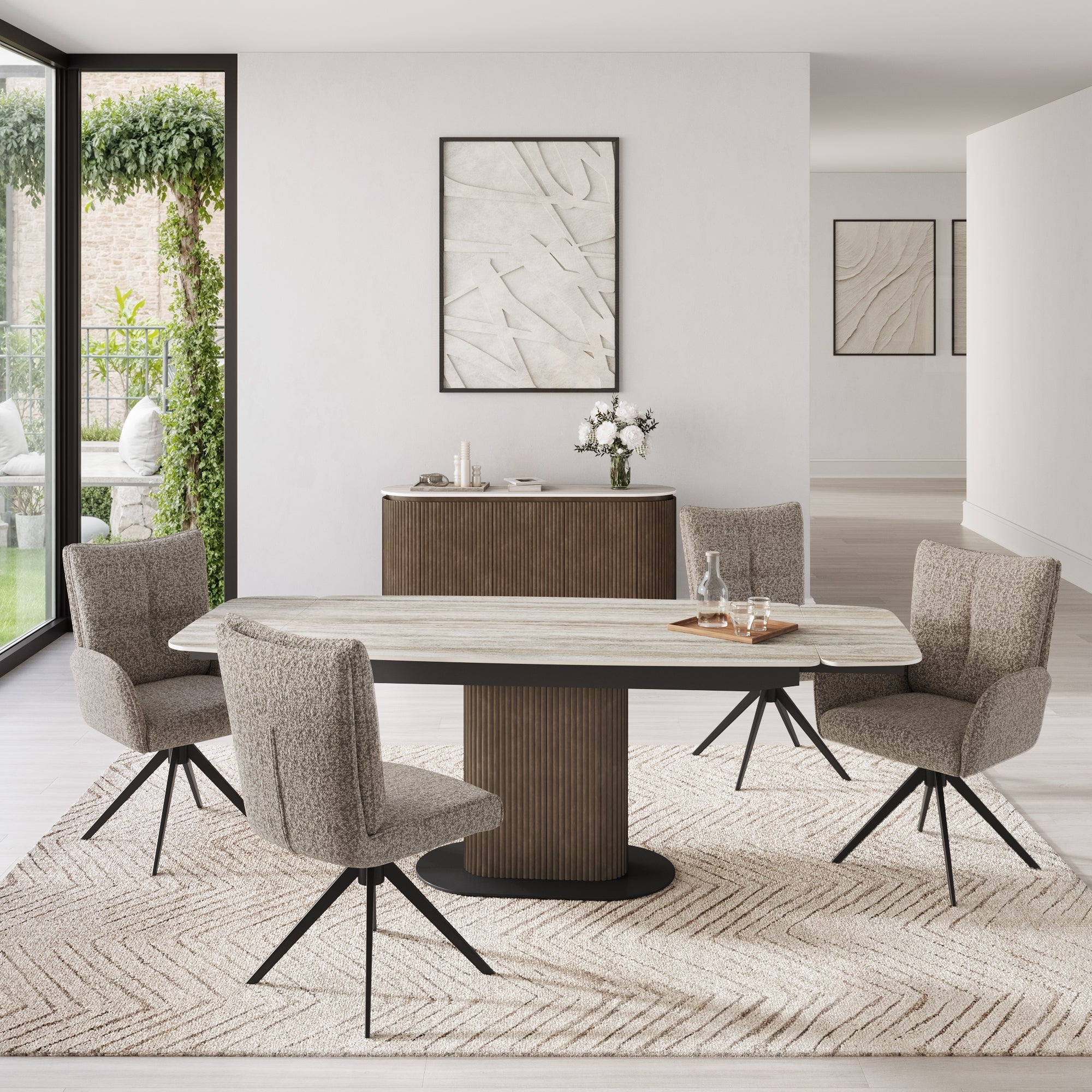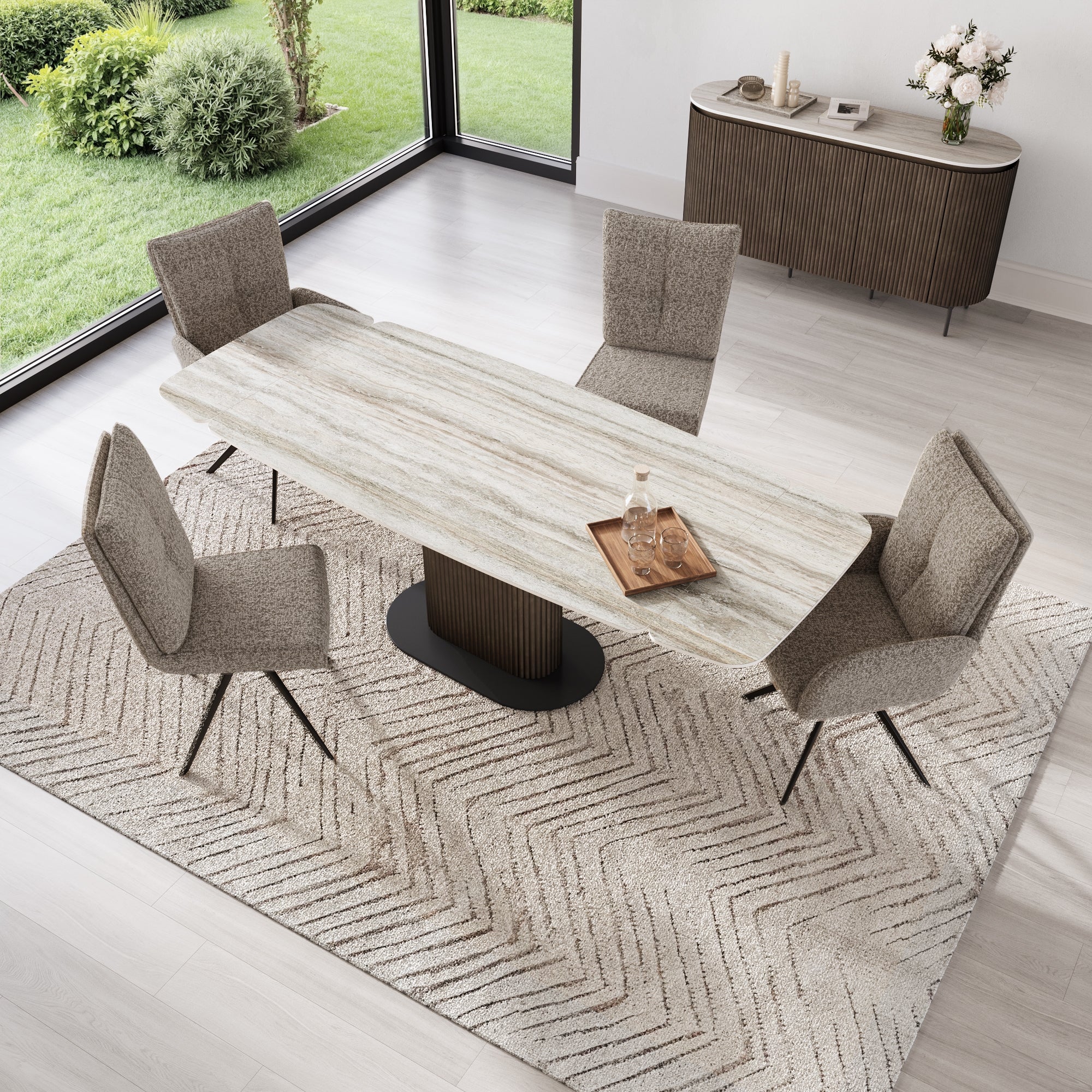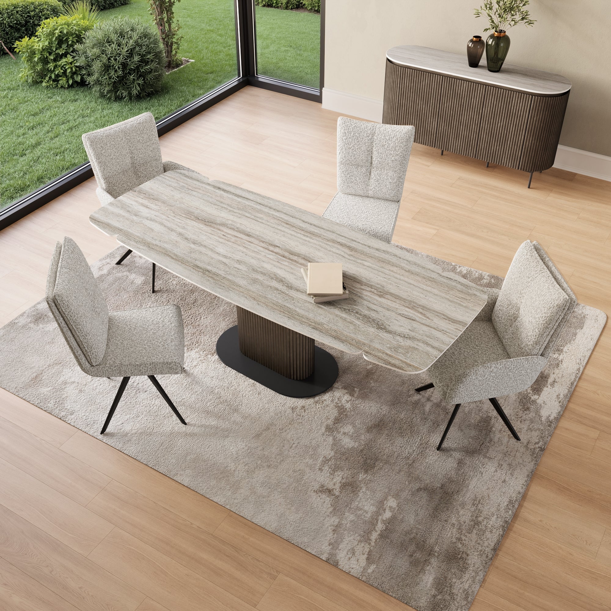 The Modena Range combines modern elegance with practical functionality, featuring an ivory grey travertine ceramic finish for lasting style and durability. The extending dining table pairs a ivory grey travertine ceramic top with a wood veneer pedestal and sturdy black metal base, featuring an end-extension mechanism for flexible seating. The Modena 3 door Sideboard complements the table with a matching ivory grey travertine top, soft-close doors, and a durable carcase, offering stylish storage for dining essentials or display items. Ideal for contemporary interiors, the Modena Range delivers sophisticated design, durability, and everyday practicality.
