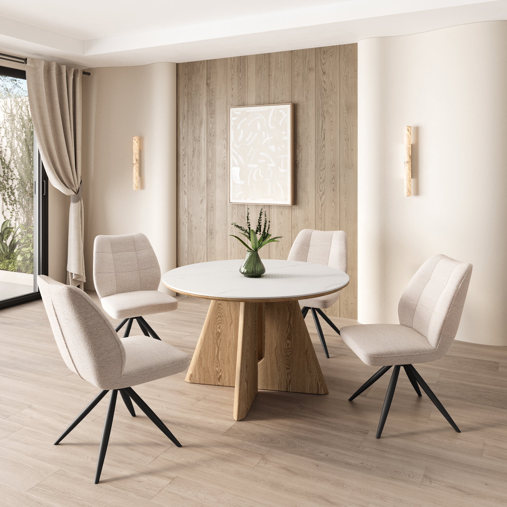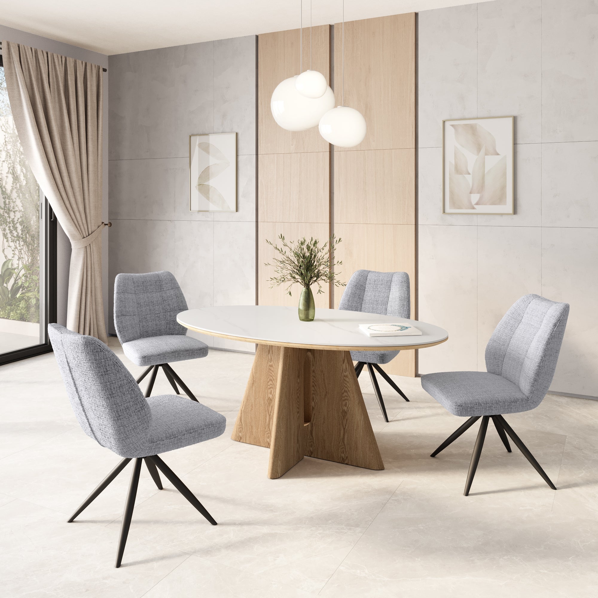 The Ravello Ceramic Dining Range combines natural elegance with contemporary design, offering a cohesive and stylish solution for modern dining spaces. Featuring a matte white marble-effect ceramic top that is heat, scratch, and stain-resistant, the range delivers both durability and refined sophistication. The oak veneer base adds warmth and texture, perfectly complementing the sleek ceramic surface. The range includes dining tables in 120cm round and 160cm oval, suitable for intimate family meals or larger gatherings. Ideal for modern dining rooms, kitchens, and open-plan living areas, the Ravello Range blends style, functionality, and lasting quality.